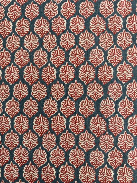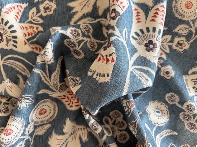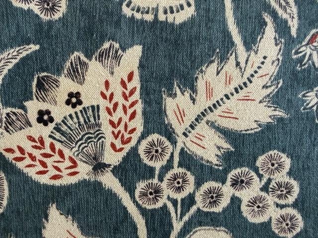 The fabric features a floral, ornamental pattern. Stylized flowers, leaves, and small berry sprigs are scattered across it. The main motifs are larger, tulip-like blossoms with decorative inner patterns. Interspersed among these are round flowers, small buds, and berry clusters.